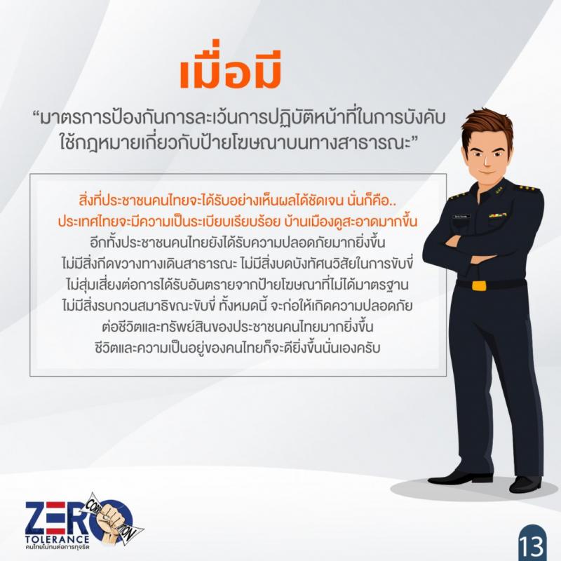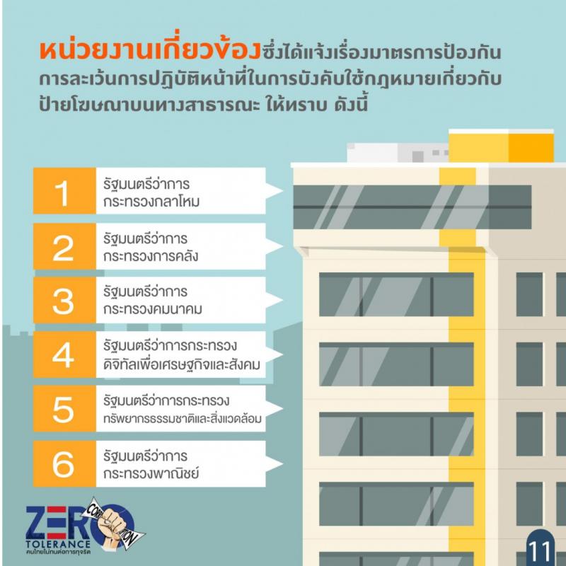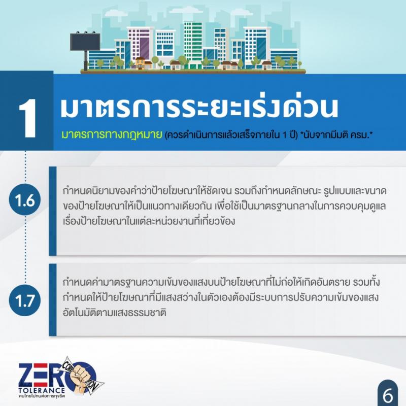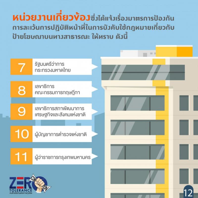 มาตรการป้องกันการละเว้นการปฏิบัติหน้าที่ในการบังคับใช้กฎหมายเกี่ยวกับป้ายโฆษณาบนทางสาธารณะ มาตรการป้องกันการละเว้นการปฏิบัติหน้าที่ ในการบังคับใช้กฎหมายเกี่ยวกับป้ายโฆษณาบนทางสาธารณะซึ่งเป็นมาตรการเพื่อปรับปรุงการปฏิบัติราชการหรือวางแผนงานโครงการของส่วนราชการ รัฐวิสาหกิจหรือหน่วยงานของรัฐ เพื่อป้องกันหรือปราบปรามการทุจริตและกระทำความผิดในกรณีต่าง ๆ ที่เกี่ยวข้องกับการบังคับใช้กฎหมายเกี่ยวกับป้ายโฆษณาบนทางสาธารณะของเจ้าหน้าที่รัฐที่เกี่ยวข้อง ซึ่งมาตรการฯ แบ่งเป็น 2 ระยะ ดังนี้ มาตรการ / สรุปสาระสำคัญ 1) มาตรการระยะเร่งด่วน 1.1) มาตรการทางการบริหาร ที่ควรดำเนินการเสร็จภายใน 6 เดือน เช่น (1) ป้ายโฆษณาทุกประเภทต้องมีเลขทะเบียนควบคุมเป็นระบบเดียว ซึ่งบ่งบอกหน่วยงานผู้ออกใบอนุญาตหรือกำกับดูแล เพื่อให้เกิดความเข้มงวดในการกำกับดูแล และจัดระเบียบ (2) หน่วยงานที่เกี่ยวข้องควรจัดให้มีช่องทางที่เหมาะสมสำหรับแจ้งเบาะแสป้ายโฆษณาหรือสิ่งอื่นใดที่รุกล้ำทางสาธารณะหรือไม่ชอบด้วยกฎหมาย รวมทั้งมีแนวทางการจัดการที่ชัดเจนและรายงานผลการดำเนินการภายหลัง
