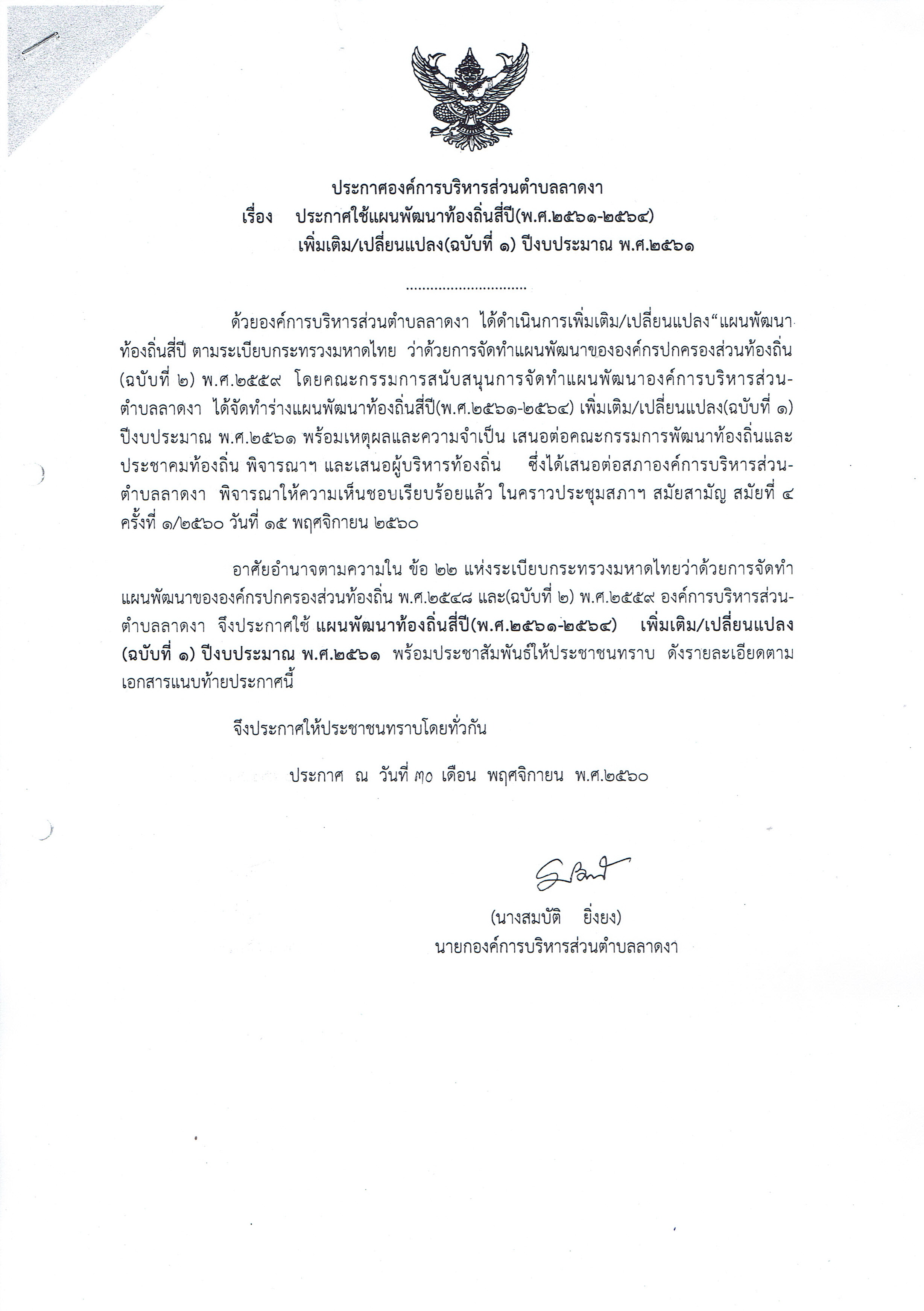 ประกาศใช้แผนพัฒนาท้องถิ่นสี่ปี (พ.ศ.2561-2564) เพิ่มเติม/เปลี่ยนแปลง (ฉบับที่ 1) ปีงบประมาณ 2561