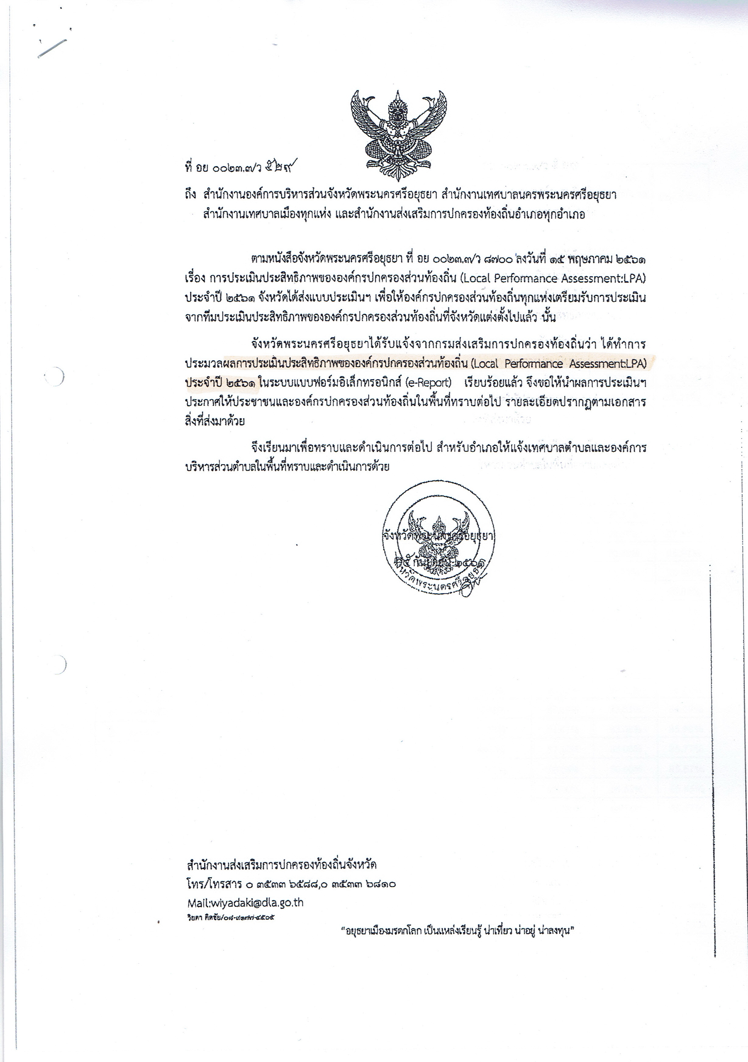 ผลการประเมินประสิทธิภาพขององค์กรปกครองส่วนท้องถิ่น ประจำปี 2561