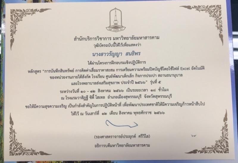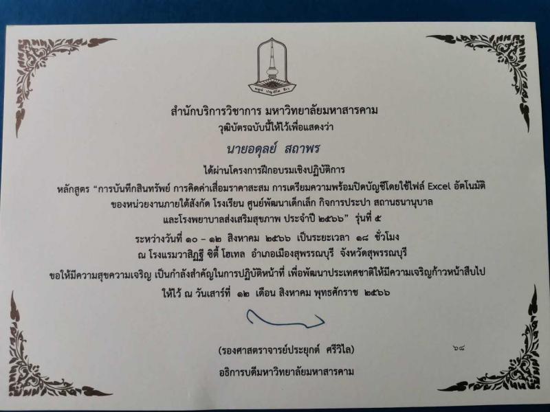 โครงการอบรมเชิงปฏิบัติการหลักสูตร"การบันทึกสินทรัพย์ การคิดค่าเสื่อม การเตรียมความพร้อมปิดบัญชีโดยใช้ไฟล์ Excel อัตโนมัติของหน่วยงานภายใต้สังกัด โรงเรียน ศูนย์พัฒนาเด็กเล็ก กิจการประปา สถานธนานุบาลและโรงพยาบาลส่งเสริมสุขภาพ ประจำปี 2566" รุ่นที่ 5