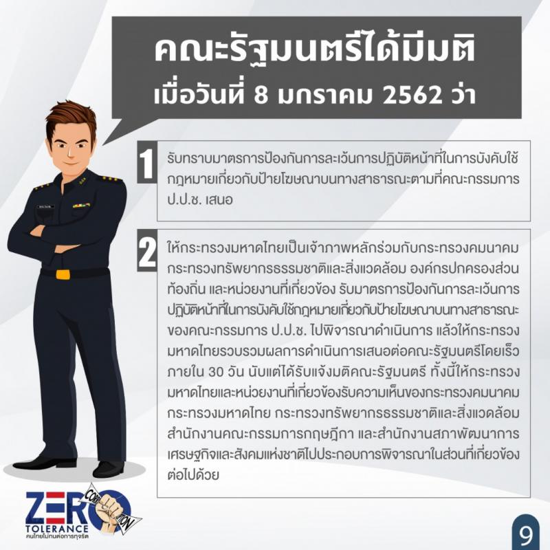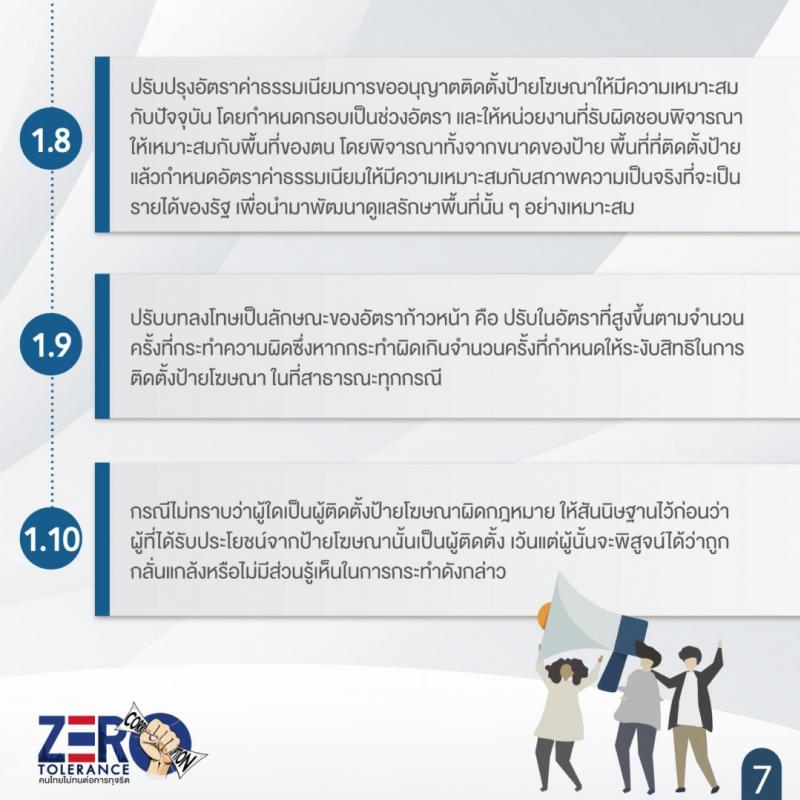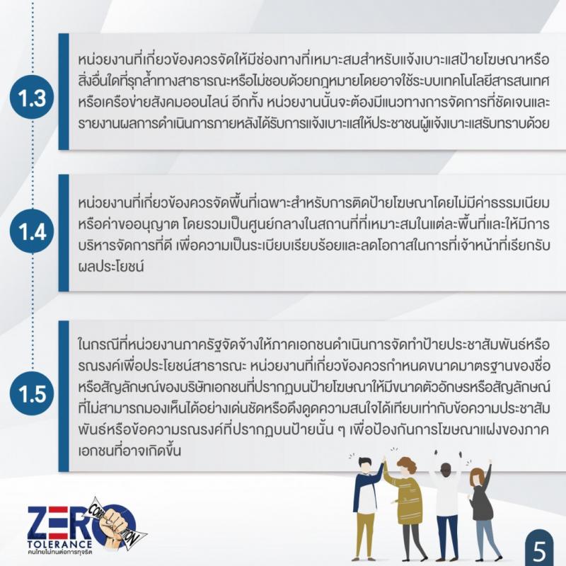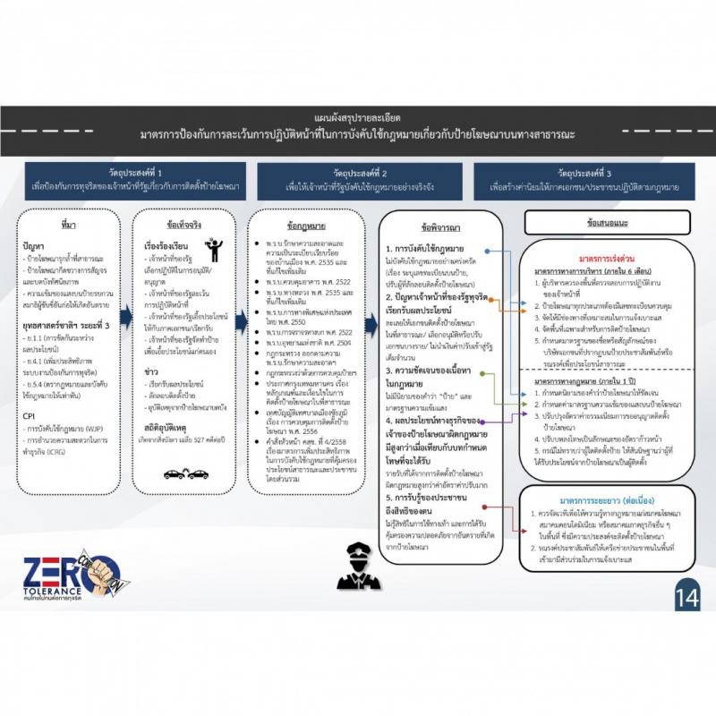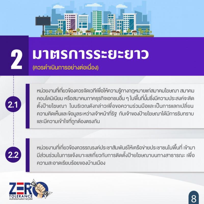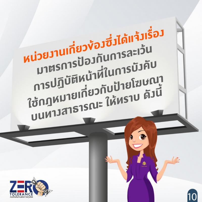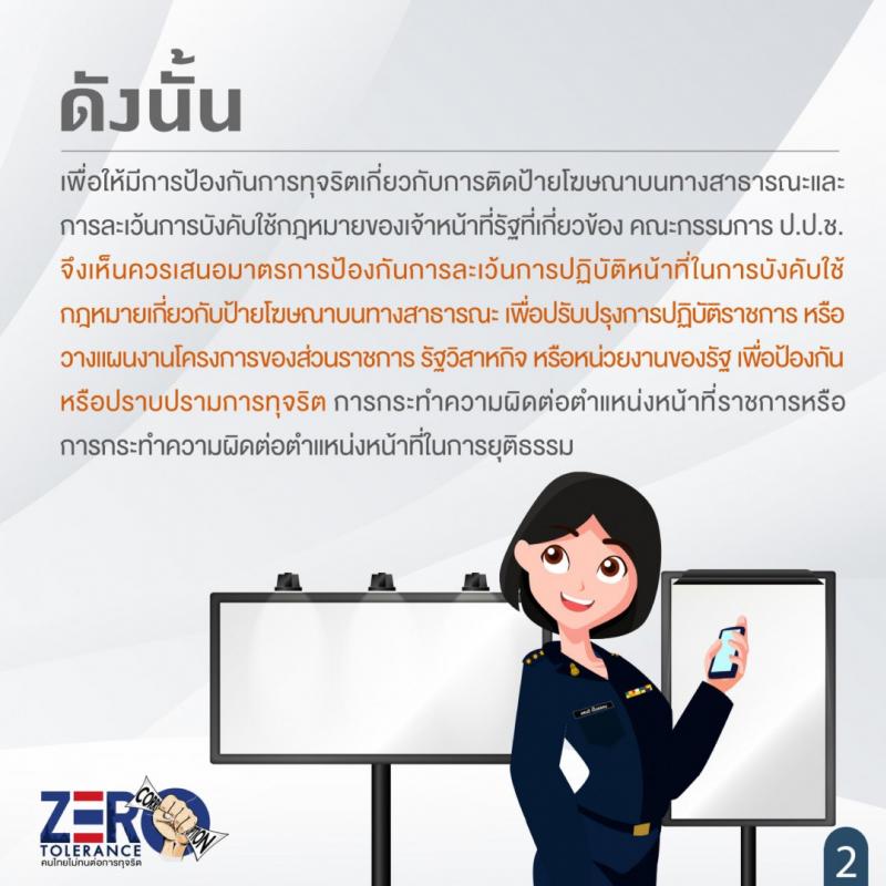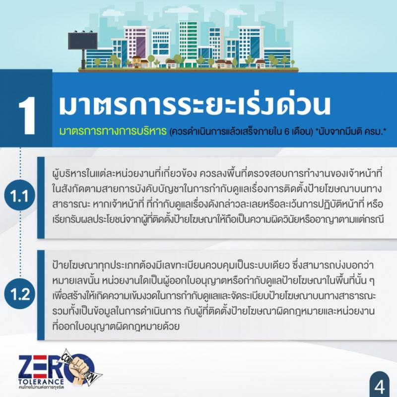 มาตรการป้องกันการละเว้นการปฏิบัติหน้าที่ในการบังคับใช้กฎหมายเกี่ยวกับป้ายโฆษณาบนทางสาธารณะ มาตรการป้องกันการละเว้นการปฏิบัติหน้าที่ ในการบังคับใช้กฎหมายเกี่ยวกับป้ายโฆษณาบนทางสาธารณะซึ่งเป็นมาตรการเพื่อปรับปรุงการปฏิบัติราชการหรือวางแผนงานโครงการของส่วนราชการ รัฐวิสาหกิจหรือหน่วยงานของรัฐ เพื่อป้องกันหรือปราบปรามการทุจริตและกระทำความผิดในกรณีต่าง ๆ ที่เกี่ยวข้องกับการบังคับใช้กฎหมายเกี่ยวกับป้ายโฆษณาบนทางสาธารณะของเจ้าหน้าที่รัฐที่เกี่ยวข้อง ซึ่งมาตรการฯ แบ่งเป็น 2 ระยะ ดังนี้ มาตรการ / สรุปสาระสำคัญ 1) มาตรการระยะเร่งด่วน 1.1) มาตรการทางการบริหาร ที่ควรดำเนินการเสร็จภายใน 6 เดือน เช่น (1) ป้ายโฆษณาทุกประเภทต้องมีเลขทะเบียนควบคุมเป็นระบบเดียว ซึ่งบ่งบอกหน่วยงานผู้ออกใบอนุญาตหรือกำกับดูแล เพื่อให้เกิดความเข้มงวดในการกำกับดูแล และจัดระเบียบ (2) หน่วยงานที่เกี่ยวข้องควรจัดให้มีช่องทางที่เหมาะสมสำหรับแจ้งเบาะแสป้ายโฆษณาหรือสิ่งอื่นใดที่รุกล้ำทางสาธารณะหรือไม่ชอบด้วยกฎหมาย รวมทั้งมีแนวทางการจัดการที่ชัดเจนและรายงานผลการดำเนินการภายหลัง
