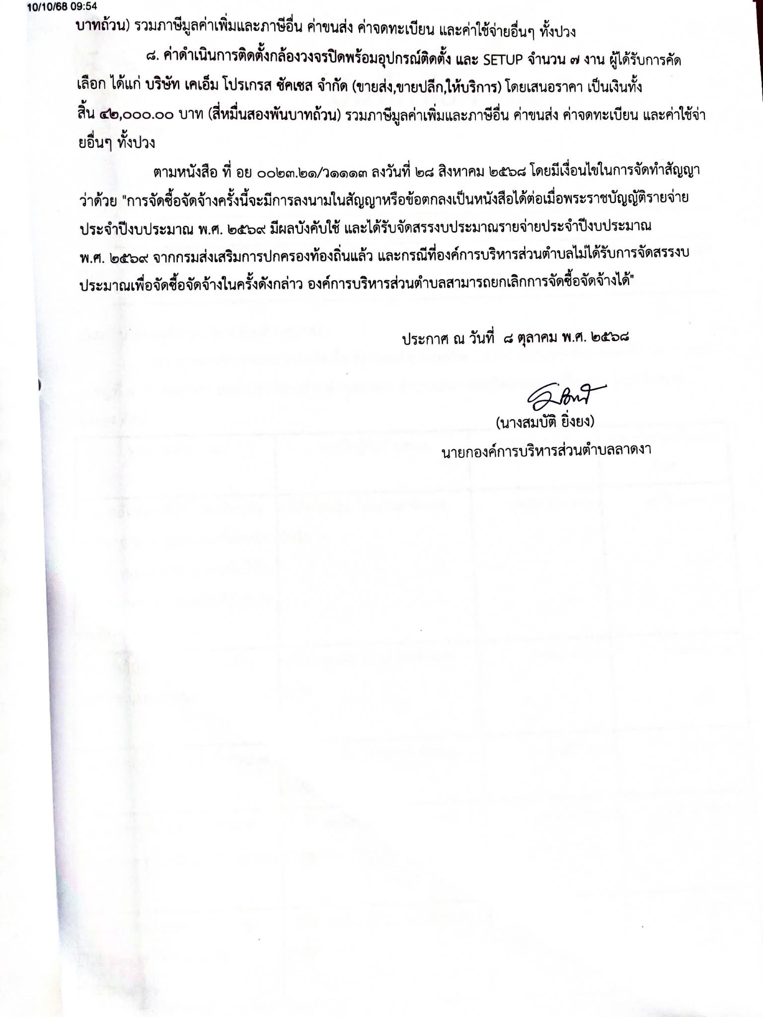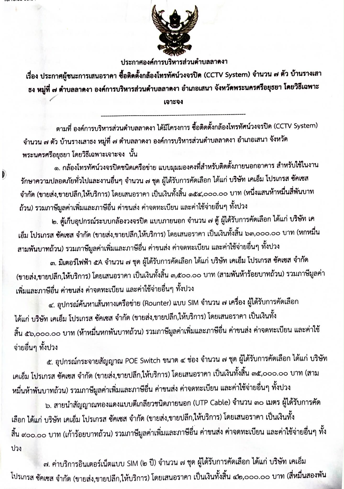 ประกาศผู้ชนะการเสนอราคา ซื้อติดตั้งกล้องวงจรปิด (CCTV System) จำนวน 7 ตัว บ้านรางเสาธง หมู่ที่ 7 ตำบลลาดงา องค์การบริหารส่วนตำบลลาดงา อำเภอเสนา จังหวั