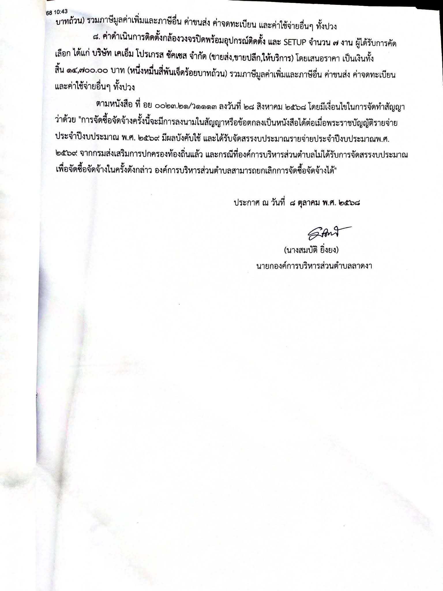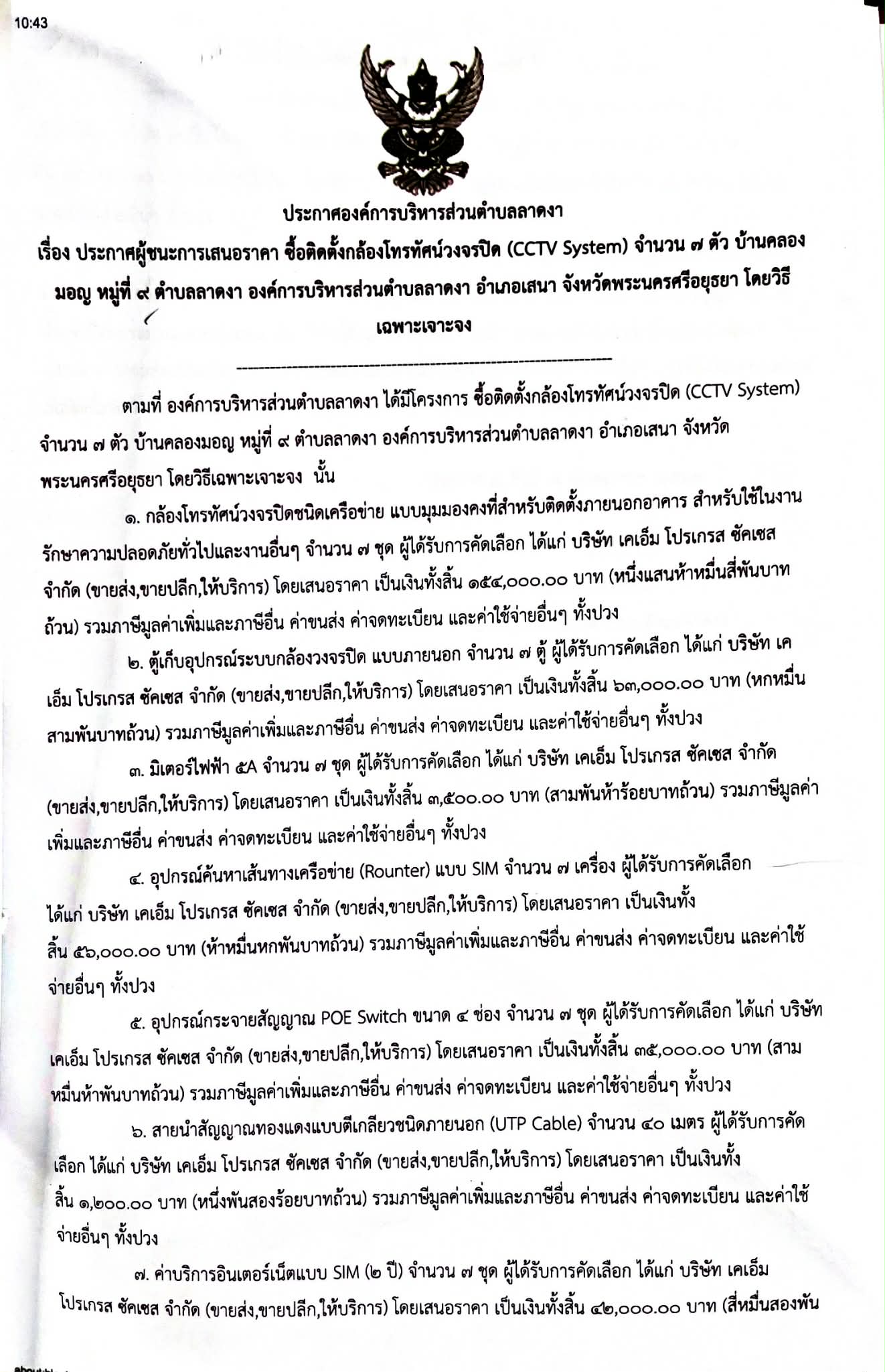 ประกาศผู้ชนะการเสนอราคา ซื้อติดตั้งกล้องวงจรปิด (CCTV System) จำนวน ๗ ตัว บ้านคลองมอญ หมู่ที่ ๙ ตำบลลาดงา องค์การบริหารส่วนตำบลลาดงา อำเภอเสนา จังหวัด