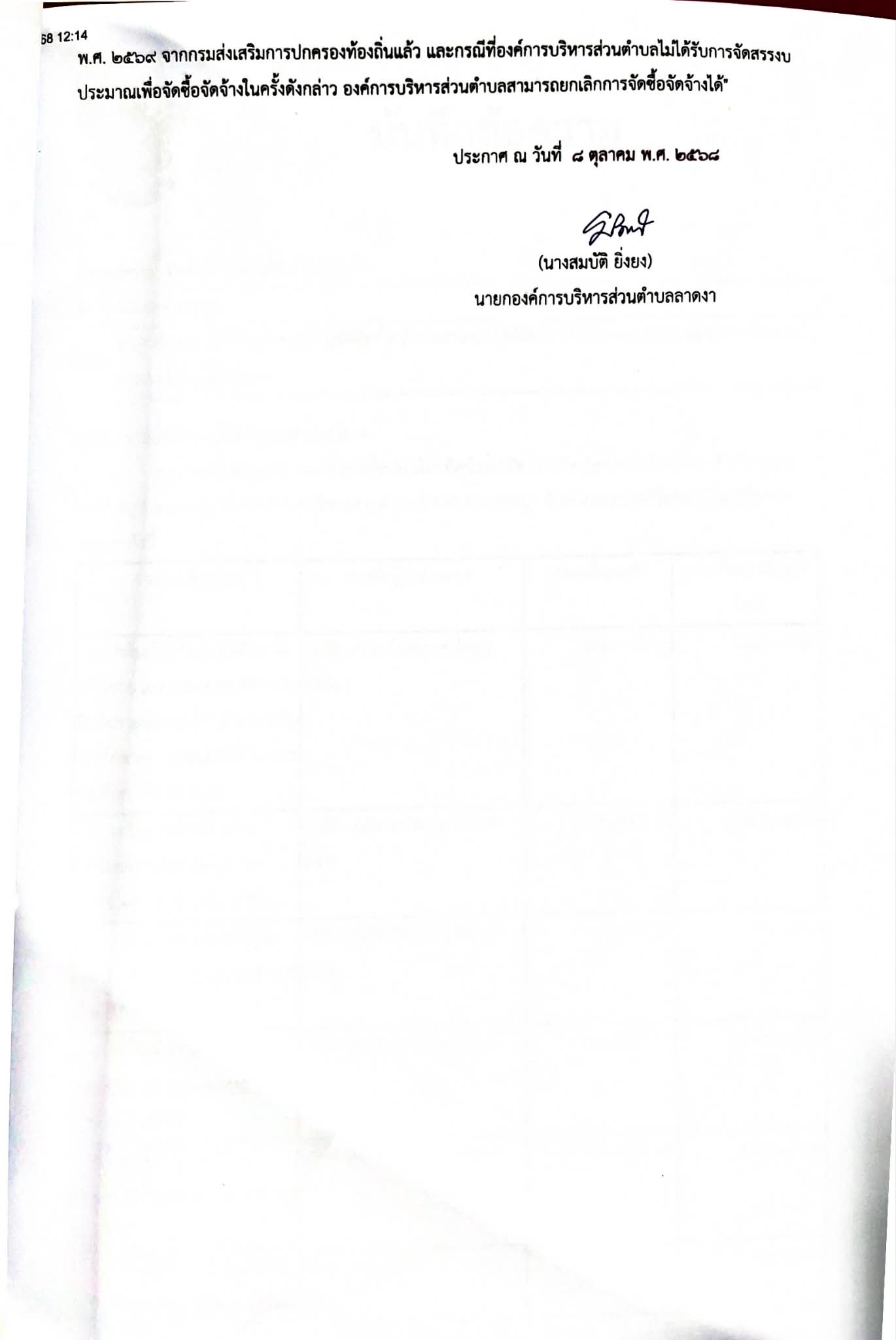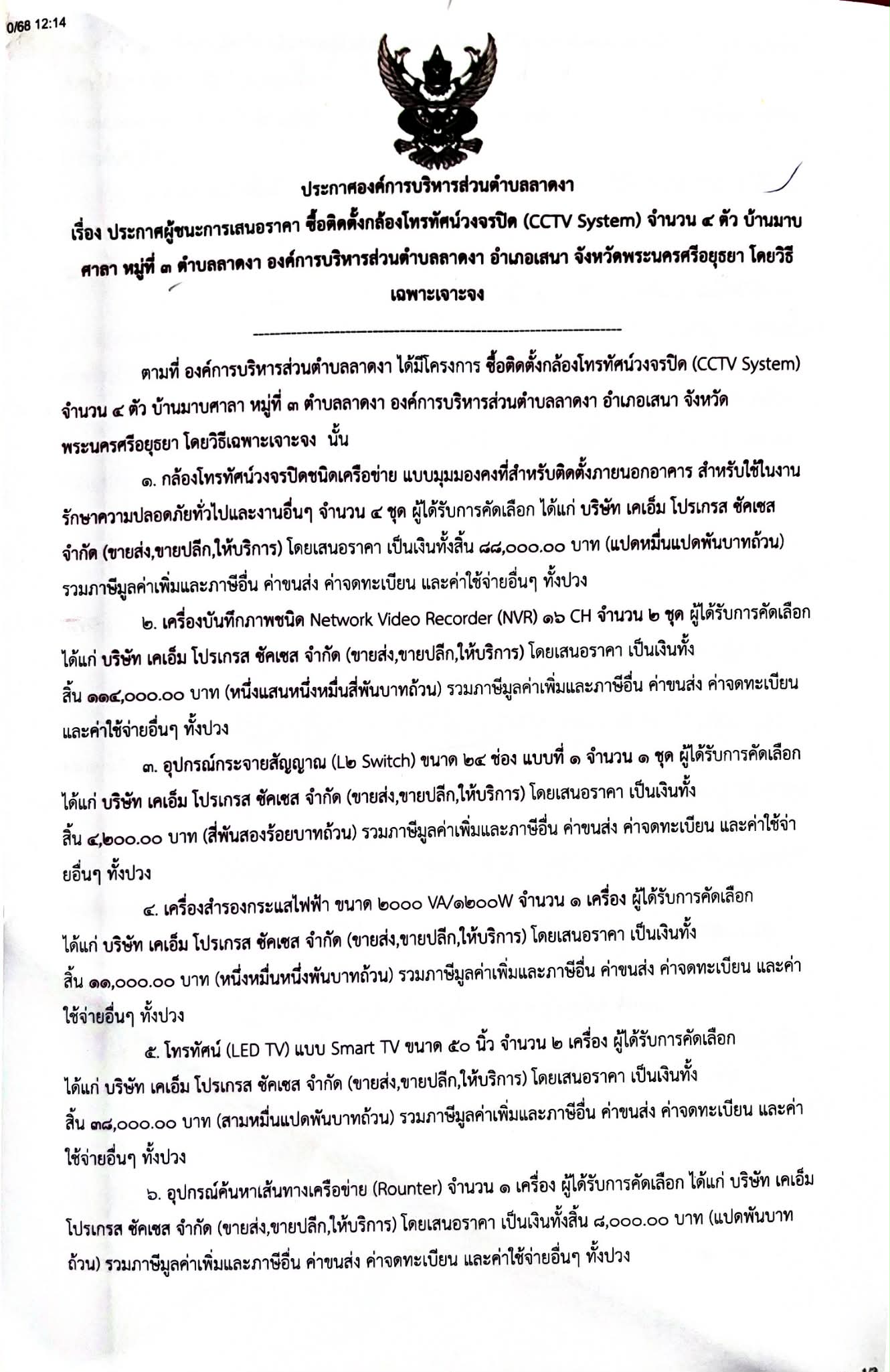 ประกาศผู้ชนะการเสนอราคา ซื้อติดตั้งกล้องวงจรปิด (CCTV System) จำนวน ๔ ตัว บ้านมาบศาลา หมู่ที่ ๓ ตำบลลาดงา องค์การบริหารส่วนตำบลลาดงา อำเภอเสนา